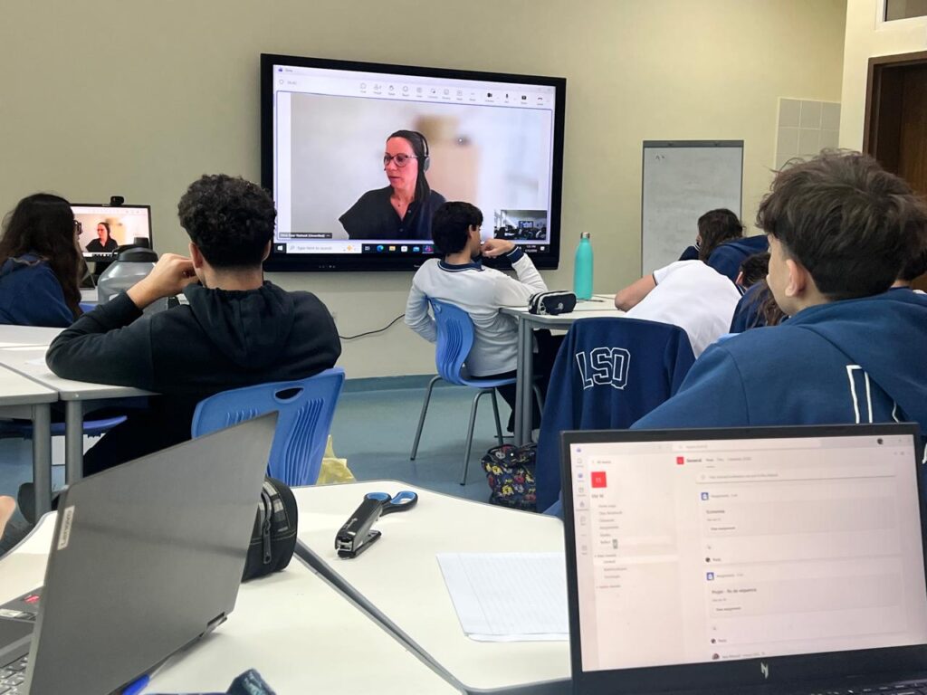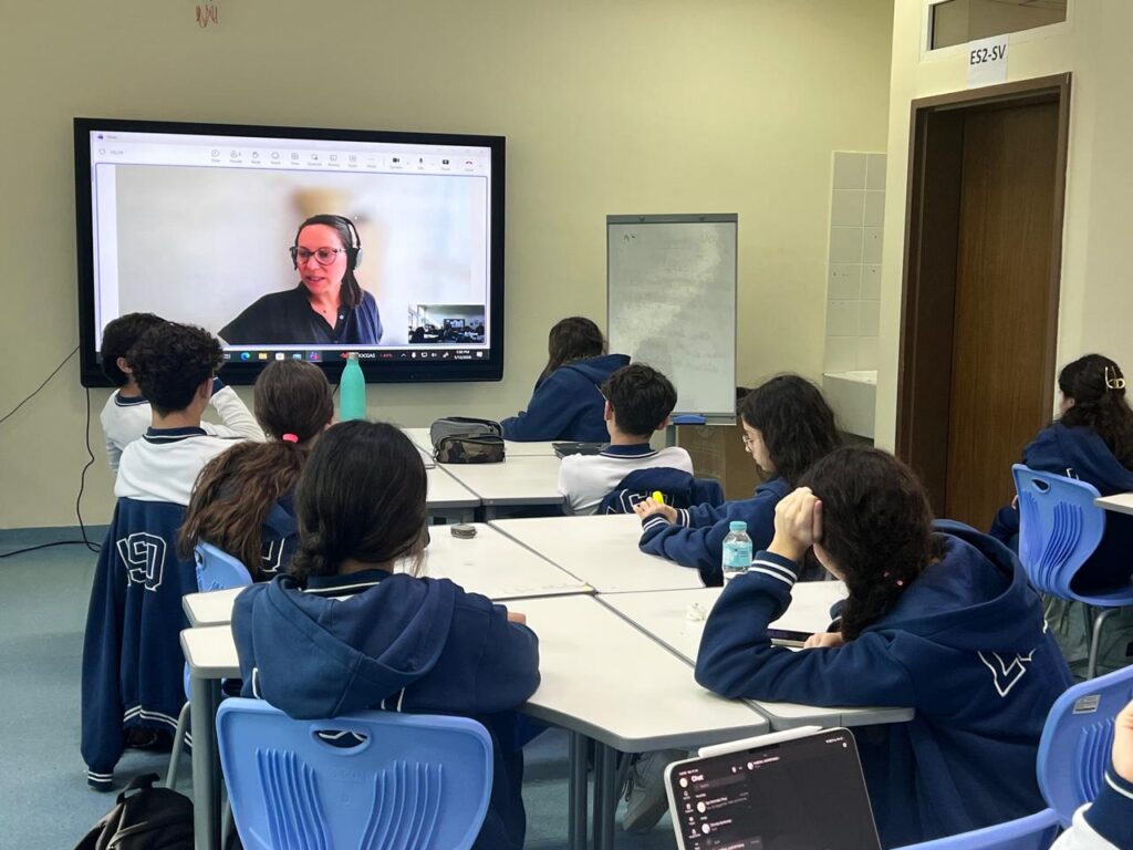 في سياقِ مقاربة القضايا الجغرافيّة المعاصرة في الصفّ الثاني الثانوي – القسم الفرنسي، وبهدفِ تعميقِ فهم الطلاّب لمحور “العولمة وأدواتها” ولا سيّما المؤسّسات الماليّة العالميّة، تمَّ تنظيمُ نشاطٍ تربويﱟ مميّزٍ تمثَّلَ في لقاءٍ تفاعليّ عبرَ الإنترنت مع السيّدة سيلفيا باور، الموظّفة في البنك الدوليّ، وهي ألمانيّة الجنسيّة، مقيمة في الولايات المتّحدة. وقد قدّمَتْ خلالَ اللقاء عرضًا واضحًا حولَ دورِ البنك الدوليّ وأبرزِ مشاريعِه وتأثيراتِه في واقعِ النّظام العالميّ الحديث، ما أتاحَ للطلاّب فرصةَ ربط ِالمفاهيم النظريّة بالواقع العَمليّ. وتميّزَ النّشاطُ بتفاعلٍ لافتٍ من الطلاّب عبرَ النقاشِ وطرح الأسئلة، ما أسهمَ في إثراءِ معارفِهم الجغرافيّة وتوسيعِ آفاقهم، انسجامًا مع هدفِ المدرسة في تعزيزِ انفتاحِ الطلاّب على العالم